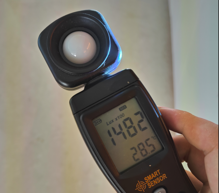 先看下如果我照度计,贴近投影仪的亮度达到了148200Lux,很夸张。而且我播放的还不是纯白色的画面哦~