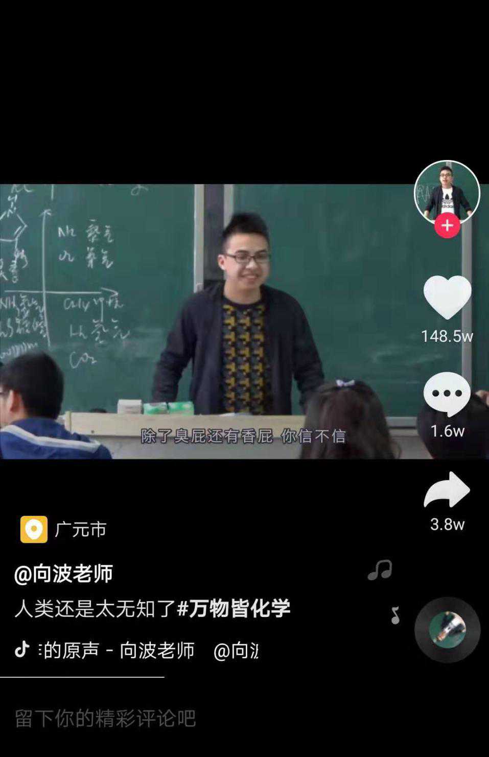抖音博主向波老师(抖音ID:xiangbo2018),虽然本尊是化学老师,但常有人认为他是化学界的情感博主,金句频出:“喜欢一个人容易,忘掉一个人很难。因为多巴胺容易分泌。”“女人防晒靠护肤品,男人防晒靠走位。”“韩剧里容易发生医学奇迹。”“有情人终成兄妹。”向老师的课堂,欢声笑语不断。