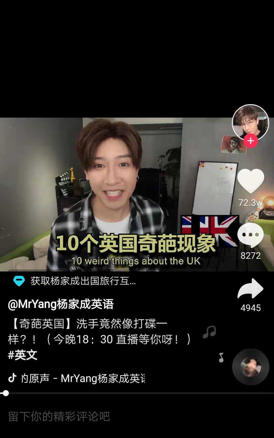 抖音上的英语老师(抖音ID:mryang911)用新奇的拍大片的方式教英语,在抖音上收获了838万的粉丝。