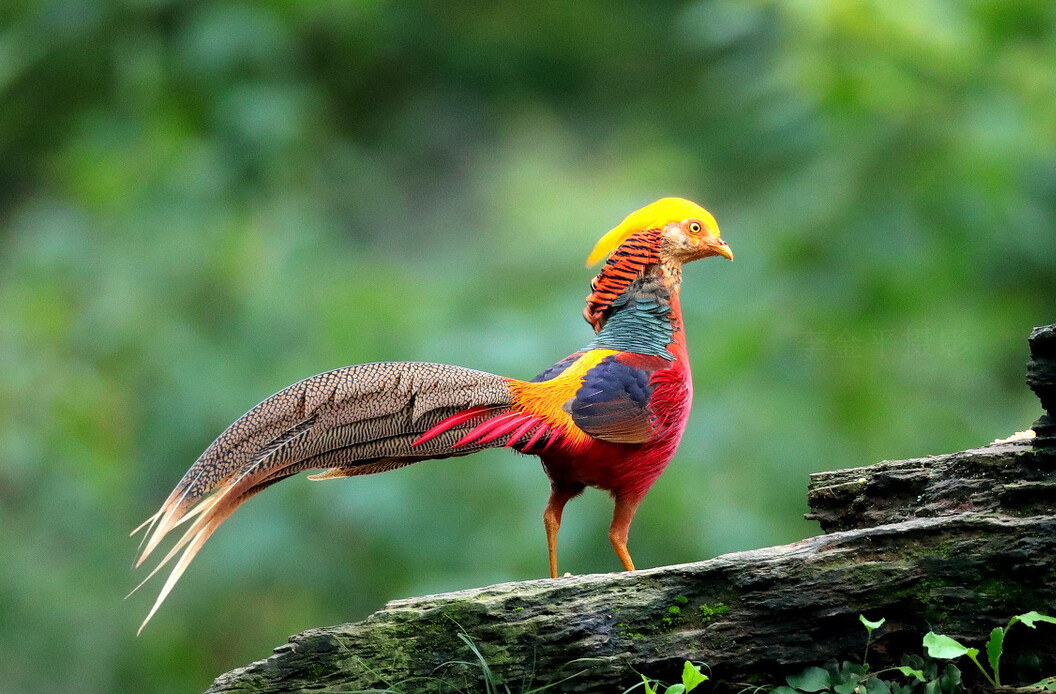 红腹锦鸡雄鸟全长约100厘米,雌鸟约70厘米。雄鸟头顶具金黄色丝状羽冠;后颈披肩橙棕色。上体除上背为深绿色外,大都为金黄色,腰羽深红色。飞羽、尾羽黑褐色,布满桂黄色点斑。下体通红,羽缘散离。嘴角和脚黄色。雌鸟上体棕褐,尾淡棕色,下体棕黄,均杂以黑色横斑。