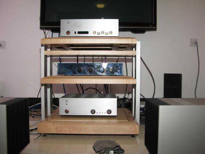 再后来我就把第2套系统卖了。只留只转盘解码。直接加入了德国之声的用家的一员,由于机器太多,放在地上那个叫心痛!这次有了买器材架的冲动。但自己是个初烧又不懂,最后请教过大烧后决定入一个FE的HD02,不试不知道,原来器材架是个大学问,没有器材架如果机器放地上,声音会变成不自然,有点紧尾音变小等等。。。而放在架上的分别是机器会宽松自然回响比较多,但最重要的是会更有平顺感,这种感觉很难用文字形容,同一台机器放在架上和地方,分别是很明显的。大约会提高机器大约3个层次吧,这是个人体会(如有大烧认为不是,请一笑而过.!就当看个菜鸟在自吹好了)