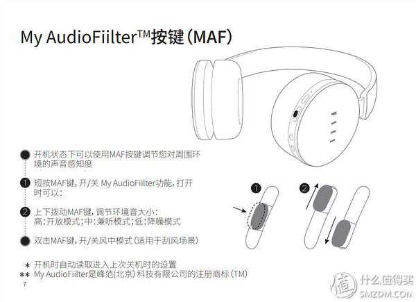 【MyAudioFiilter键】:与MFB键不同,MAF键主要负责降噪功能的开关和模式切换,这个键位的使用方式分成了按压和滑动,具体功能见下图。