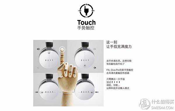 ▼通过手指在耳罩的外侧上下左右滑动实现功能的调节,上下负责音量、左右负责切歌。实际的使用过程中,滑动必须要触及FIIL灯才会生效。
