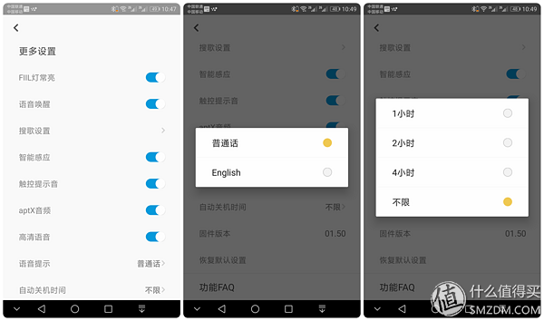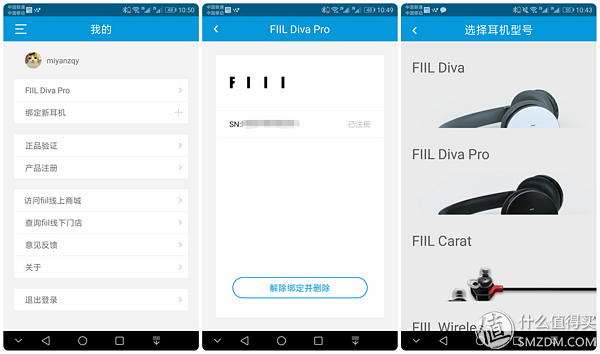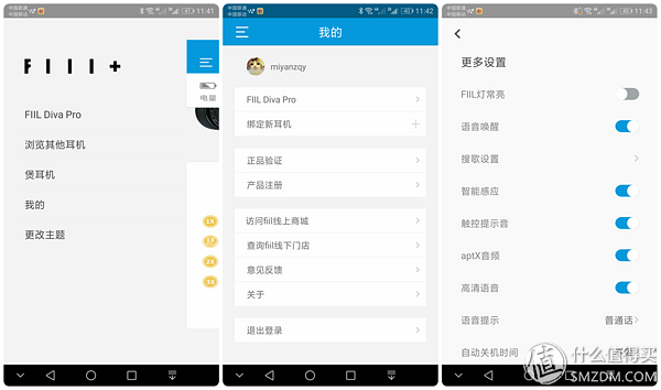 ▼FIIL+的菜单选项共有3个,一个针对APP的设置(下左),一个针对账户的设置(下中),最后一个针对绑定耳机的设置(下右),个人感觉,针对APP和账户的菜单选项可以合并。