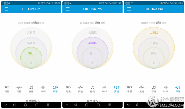 ▼MaxWide3D音效是FIILDivaPro的独占功能,从客厅到小剧场和大剧院,提供了不同的声场选项,试听感受是声场不断地开阔,但是这种音效会造成音质的扭曲,所以不是很建议大家开启这个功能。