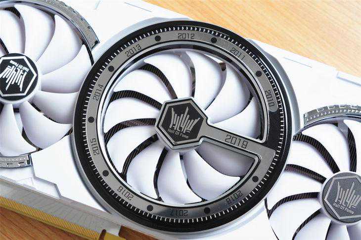 显卡本体采用名人堂系列一贯的纯白配色,散热器采用三枚90mm风扇。