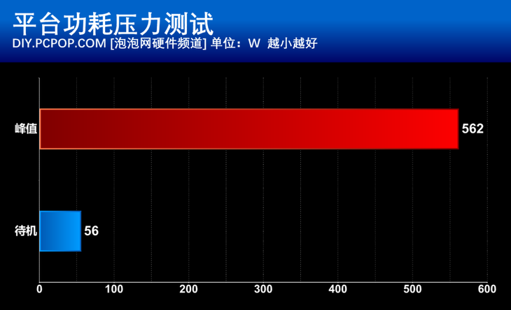 可以看到,满载功耗达到了562W,考虑到电源转换效率,至少需要650W以上的电源才可以满足需要。