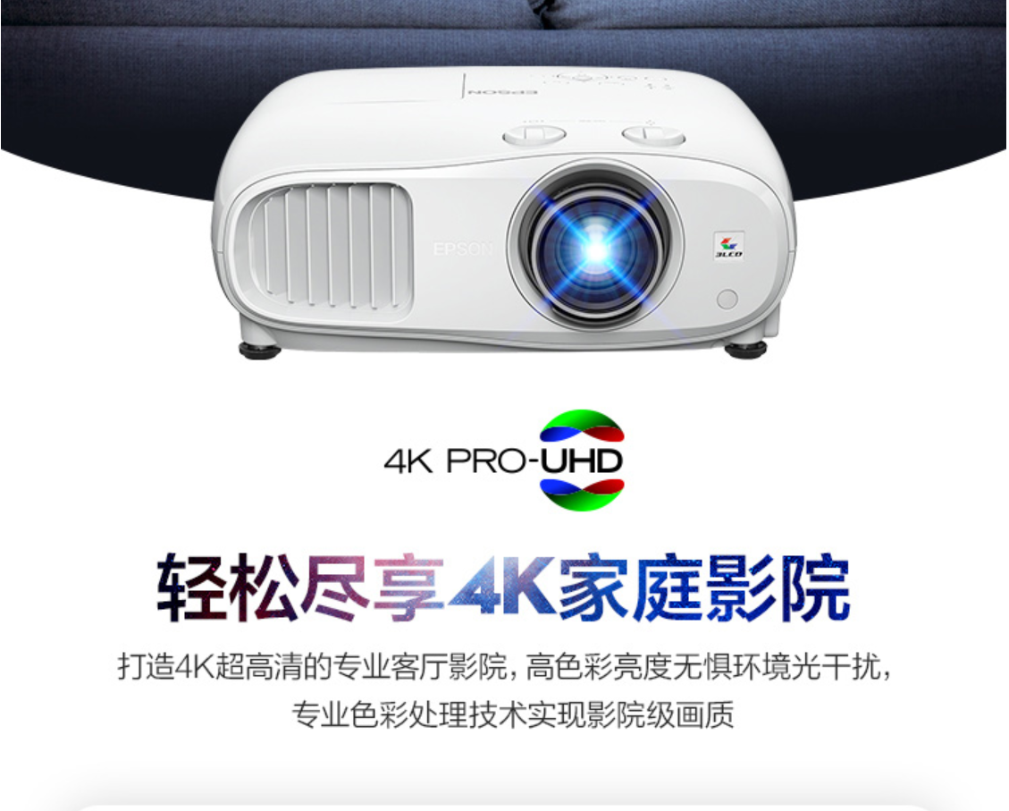 爱普生CH-TW7000是TW6300的升级款,拥有3000流明、2000:1的对比度,增加了4K的支持,支持HDR显示。1.6倍变焦镜头,在3米距离就可以投射100寸画面,而且支持水平和垂直的大幅度位移,一款非常值得推荐的机器。