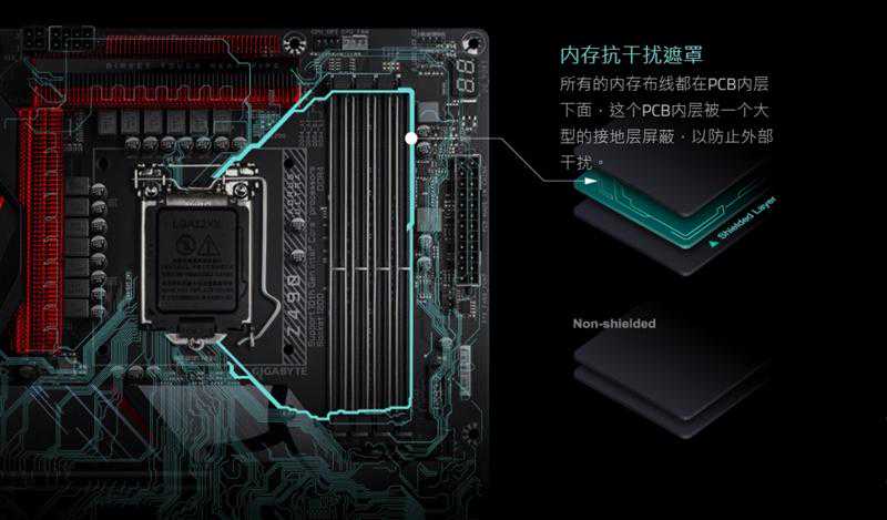 Z490AORUSULTRAG2主板所有的内存布线都在PCB内层下面,这个PCB内层被一个大型的接地层屏蔽,以防止外部干扰。