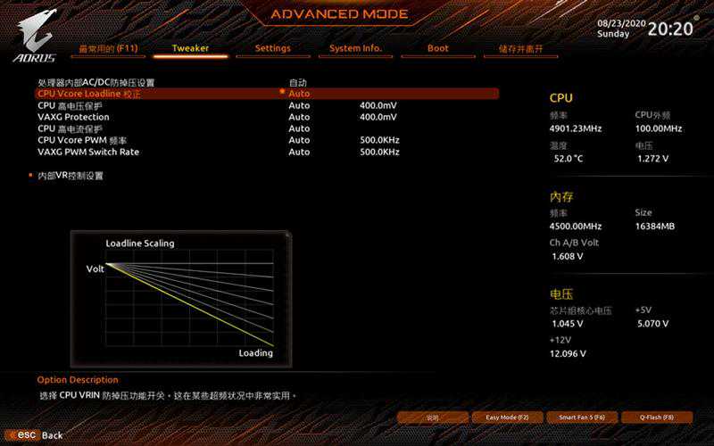 防掉压一共有8个等级,我们对i9-10900K设置防掉压时,发现高负载下选择“Turbo”即可以保证电压的稳定。
