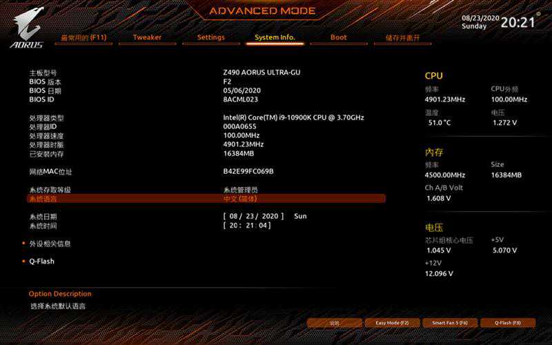 Z490AORUSULTRAG2主板加强了对高频内存的支持,能够支持5000MHz+频率的DDR4内存。
