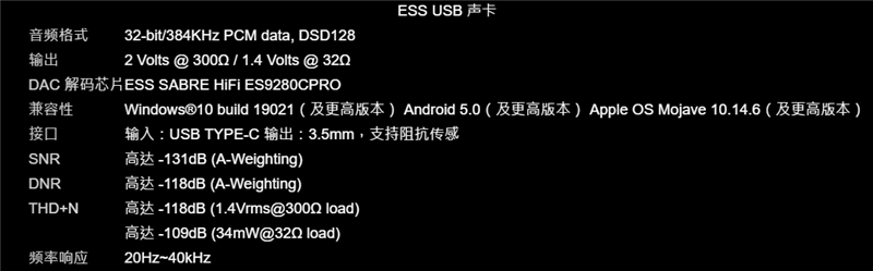 ESSentialUSBDAC在信噪比高达-131dB,DNR稍低也有-118dB,频响20Hz~40KHz算是中规中矩。