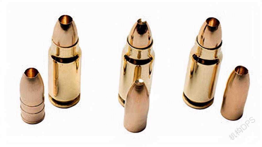 PSD手枪可使用的3种枪弹。自左至右为:9mm、10mmAuto、7.5mm弹