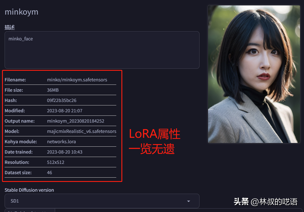 LoRA的属性一览无遗,底模,分辨率,训练时间,训练集信息一目了然。