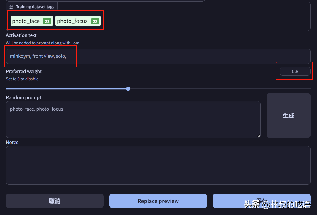 训练集使用的tag自动读取,很有借鉴意义。你也可以填上触发词和最佳权重,保存之后备用。