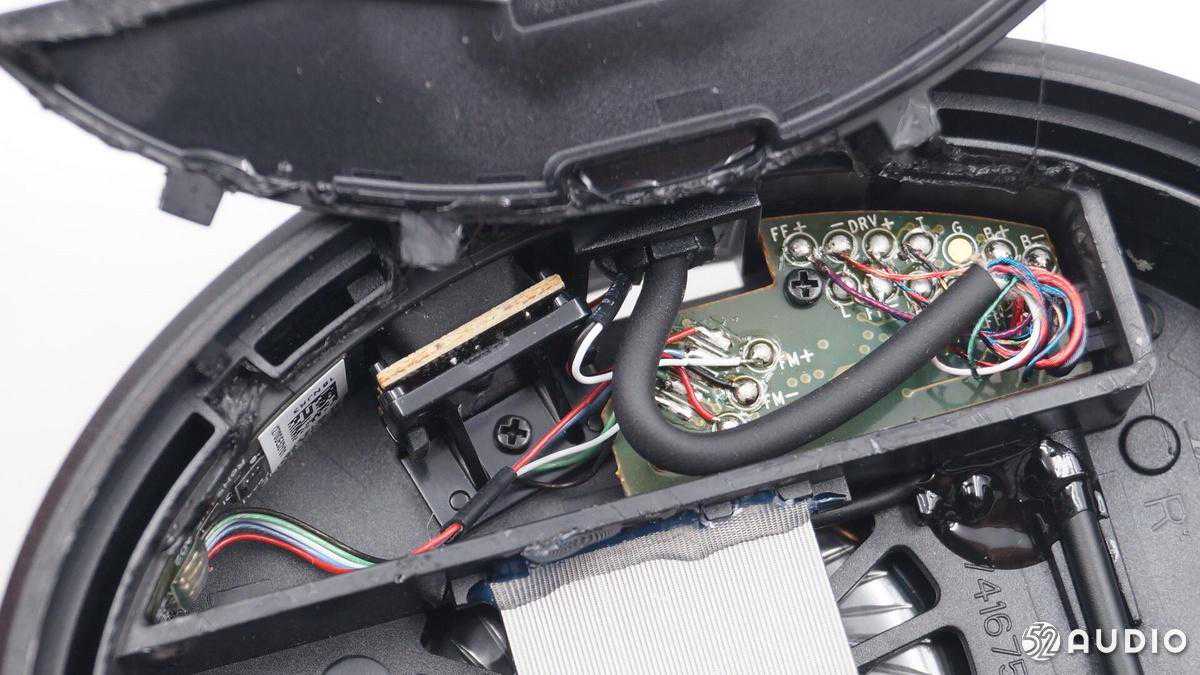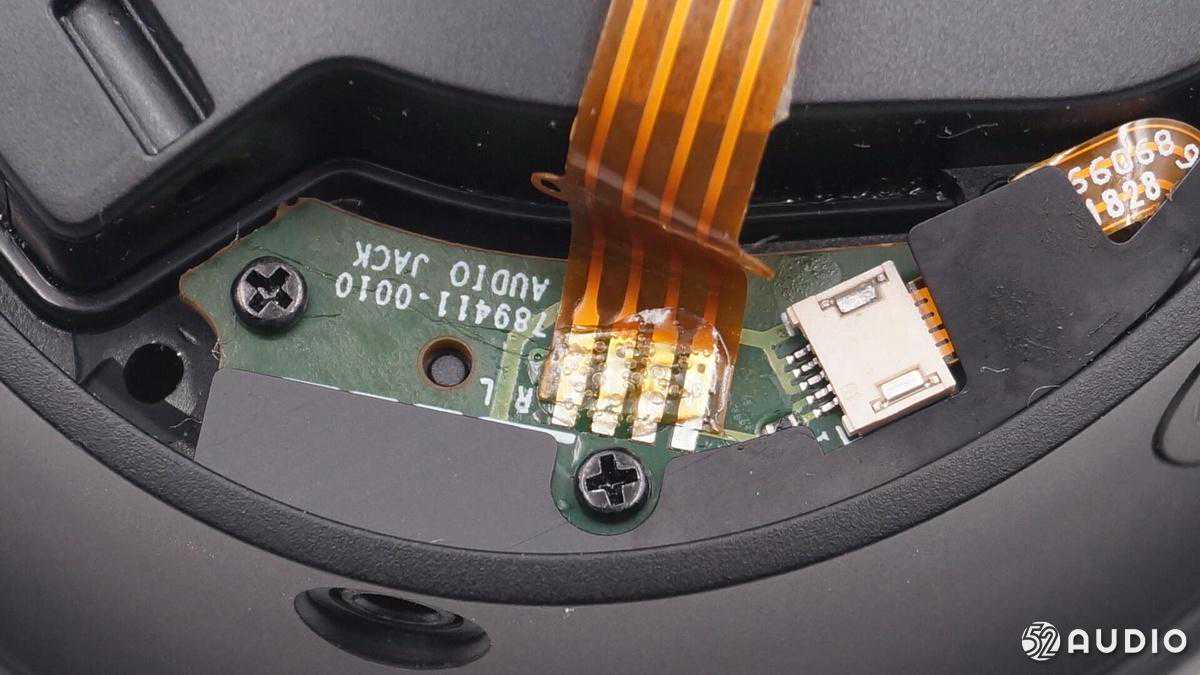排线通过双面胶固定在扬声器音腔上,连接端口小板和耳机主板。