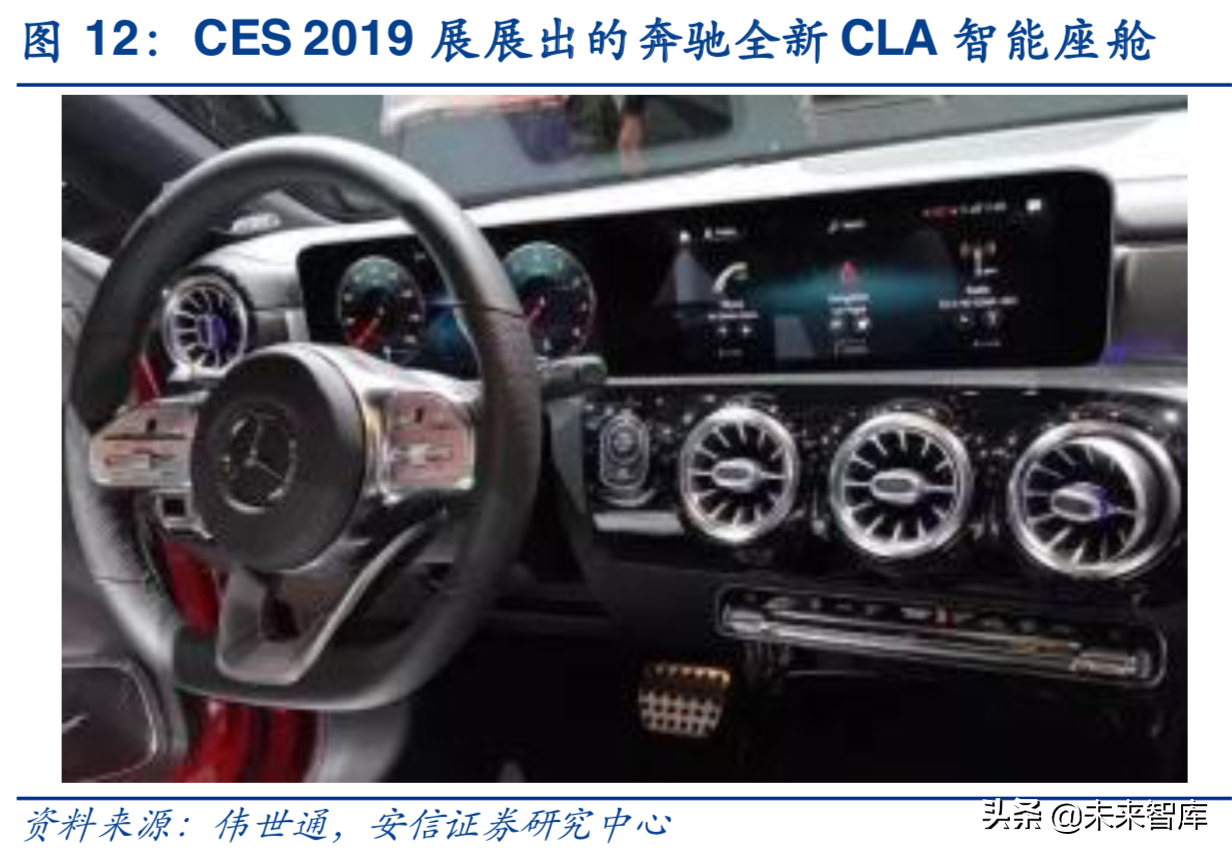 未来的智能驾驶舱可从2019CES展中窥见一斑。奔驰、宝马、丰田、拜腾等车企均在2019年1月举行的CES展中展出搭载新概念智能驾驶舱的车型。其中,奔驰发布了全新CLA车型,双10.25英寸大屏的全液晶仪表+中控屏上搭载了全新的MBUX人机交互系统,这套MBUX具备学习能力,可使用23种语言的语音到意义和自然语言理解来提供会话智能。宝马展示的VisioniNEXT车型搭载了一大一小的两块屏幕,预计2021年上市,届时宝马将携手阿里巴巴将天猫精灵智能语音助手整合并推出。丰田ACES概念舱配备独特的“体型和姿势检测系统”,具备强大的感知能力,它使用摄像头、座椅传感器检测乘客的眼睛位臵、体型大小和姿势以便座椅和安全带自动调整,若检测到驾驶员正昏昏欲睡,还能利用音乐和振动帮助驾驶员保持清醒。拜腾首款BYTONM-Byte预计于19年年底实现量产,拜腾的多屏融合是其最大亮点,48共享全面屏用非常直观的方式显示车辆和驾驶信息以及丰富的通讯、娱乐等内容。