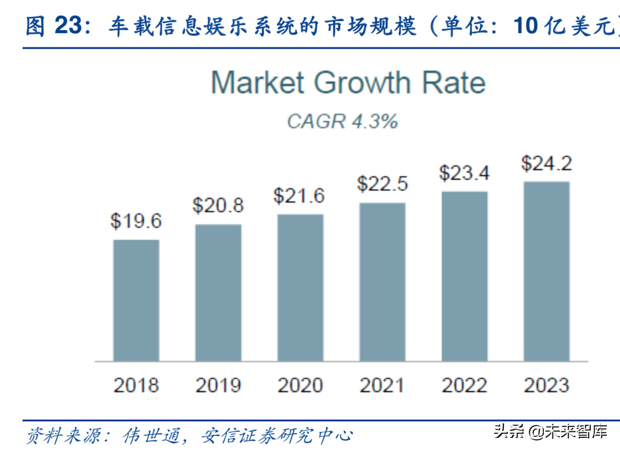 全球超千亿,行业空间进一步增长。根据伟世通,2018年全球车载信息娱乐系统(含显示屏)市场空间为196亿美元,折合约1300亿元。未来随着渗透率提升,多屏化、大屏化及功能逐渐多样化,行业空间仍将进一步增长,预计至2023年全球市场空间可达242亿美元,折合约1600亿元。