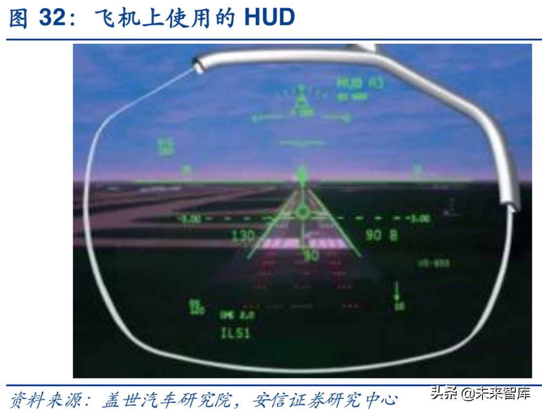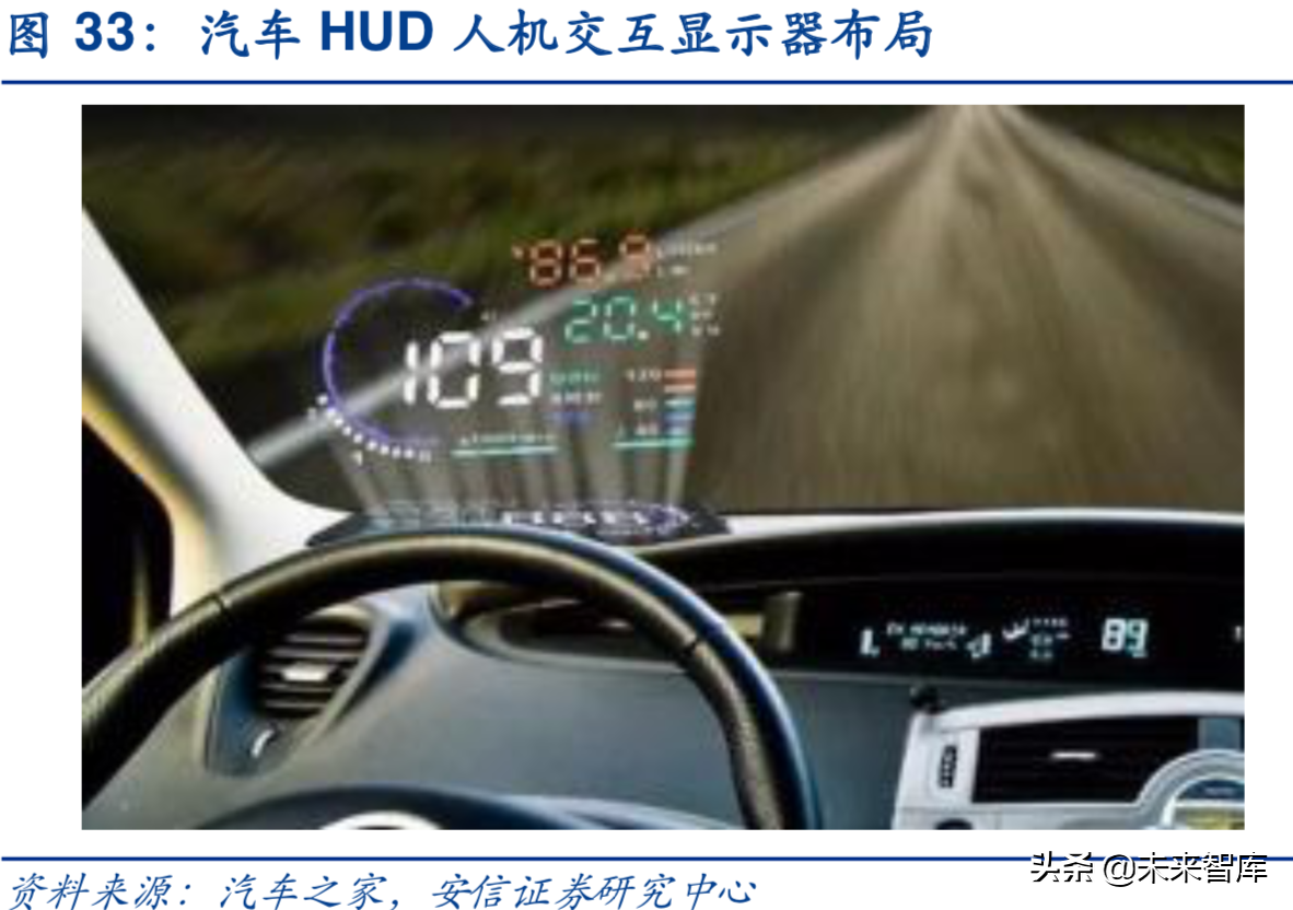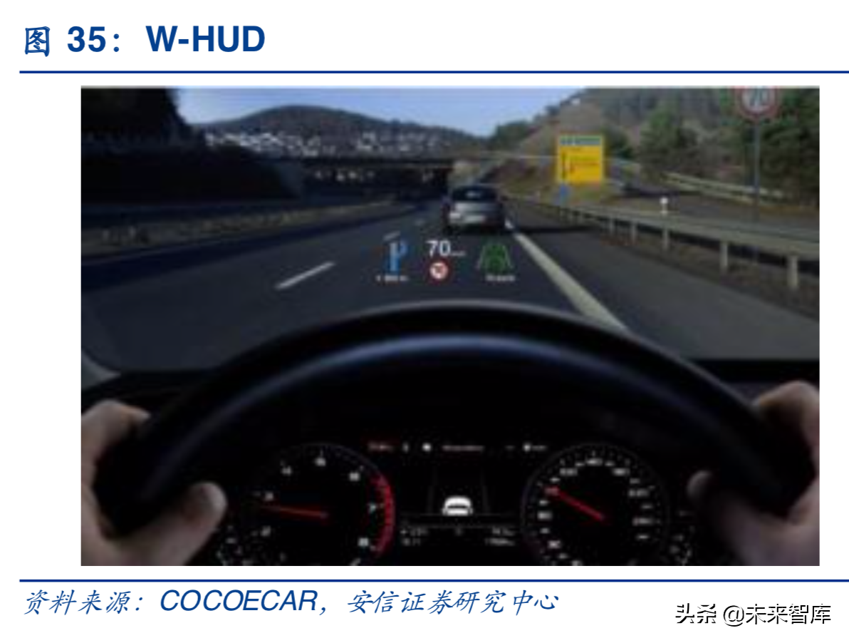HUD即抬头显示器,是HeadsUpDisplay的缩写,是目前普遍运用在航空器上的飞行辅助仪器以降低驾驶员低头查看仪表的频率,避免注意力中断以及丧失对状态意识的掌握。在大尺寸中控屏尺寸备受追捧的当下,车载显示产生了分散驾驶员注意力的安全隐患,车载HUD应运而生,最早出现在80年代末,随即2001年、2004年通用、宝马分别推出彩色HUD,随着技术逐渐成熟,HUD目前已普遍运用在豪华车上,部分日常家用汽车亦有装载。