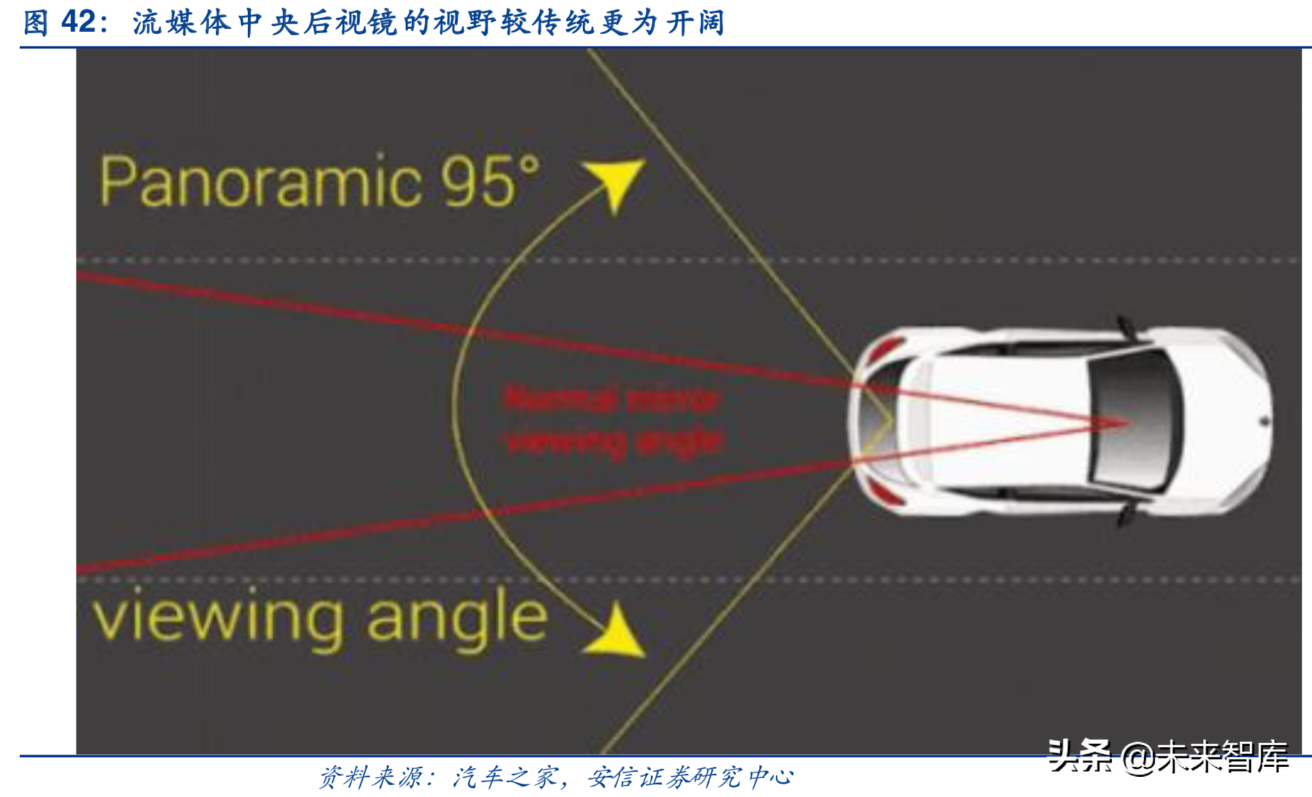 流媒体后视镜相较传统后视镜的优势之处:1)摄像头安臵在车后,拍摄范围不受车厢影响,解决了后排、后窗、C柱视线遮挡;2)通过广角镜头增大后视视野三倍以上,原生视角不变形;3)消除光线强烈变幻场景时的眩目;4)夜晚后视效果极佳,天气不好时认可提供良好视野。