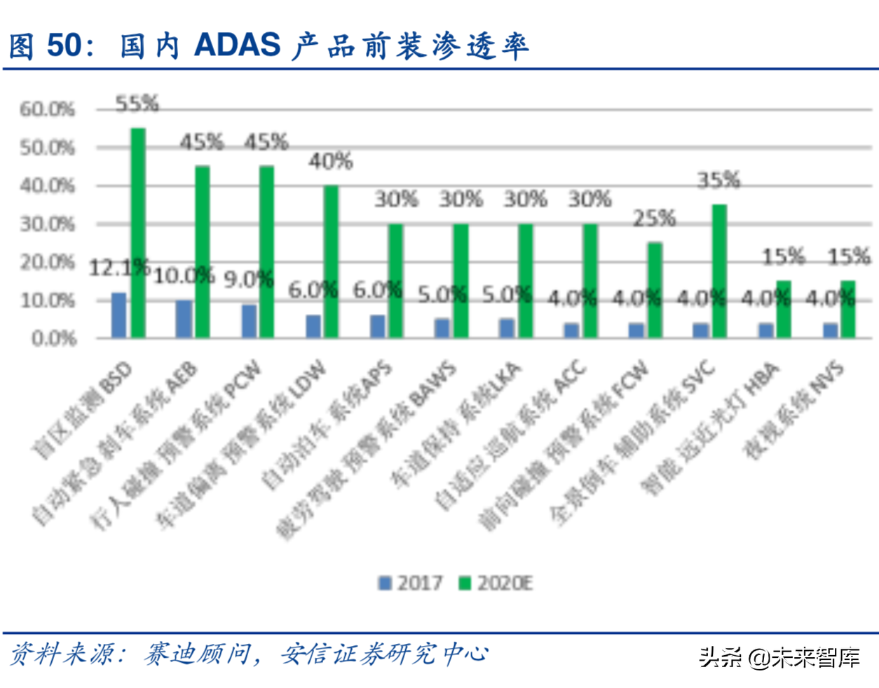 ADAS由多项配臵协调系统构成,通常包括自适应巡航系统ACC,车道偏移报警系统LDW,车道保持系统LKA,前撞预警系统FCW,自动紧急制动AEB,夜视系统NVS,盲点探测系统BSD,全景泊车系统SVC等。在汽车自动驾驶的技术演进过程中,ADAS扮演了未来汽车实现自动驾驶的先导性技术,起到承上启下的重要作用。