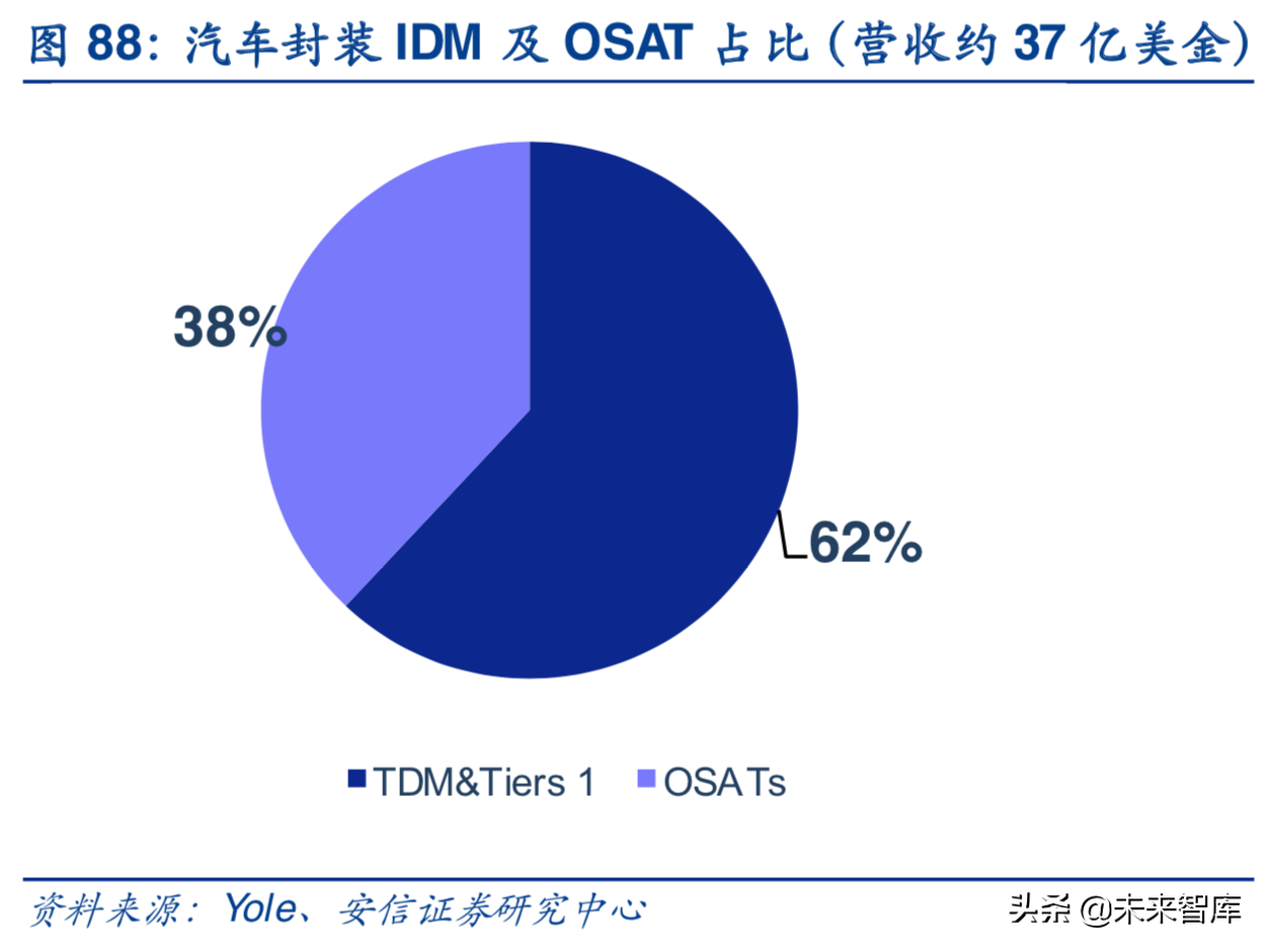 “新势力”切入,国内封装企业逐渐获份额:在FAB之外,还有封装。根据Yole最新报告,安靠和日月光目前占到80%的份额,但是也会有一些新势力会进入。长电科技收购星科金朋后,2017年在汽车封装领域占比大约为5%,太极实业苏州工厂主要以欧洲的客户为主,一直做车规级封装产品。根据我们产业链调研,通富微电在汽车电子业务的规模相对较大,率先切入新能源汽车行业领先客户,未来将依据公司的先发优势进一步拓展汽车电子产品。同时,华天科技也有规划上车规封装产线。预计随着FAB厂和封装厂的国产化支持,国内发展汽车半导体将有一定的产业基础。