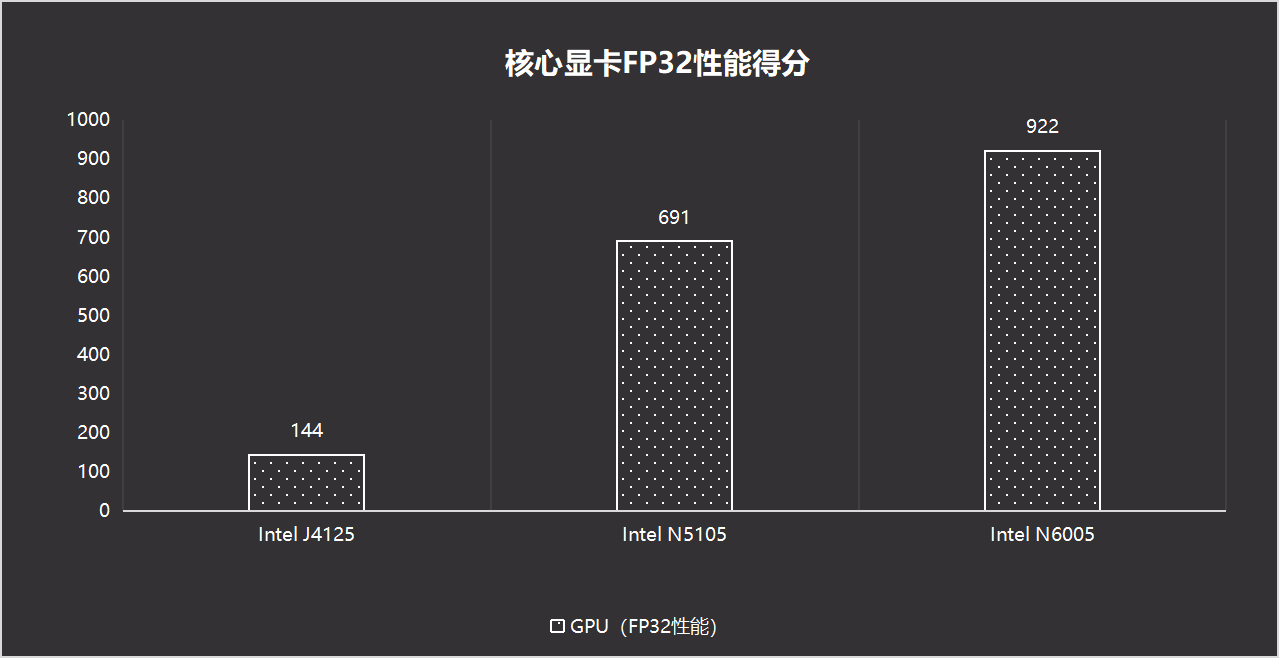 最后是显卡单精度浮点性能(FP32)测试,越高代表显卡性能越强。相比较N5105,IntelN6005集显性能提升33%;相比较与J4125,IntelN6005集显性能提升至640%。集显性能提升过于恐怖了!