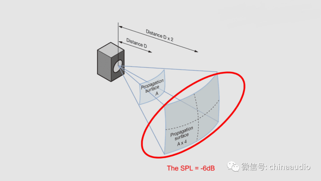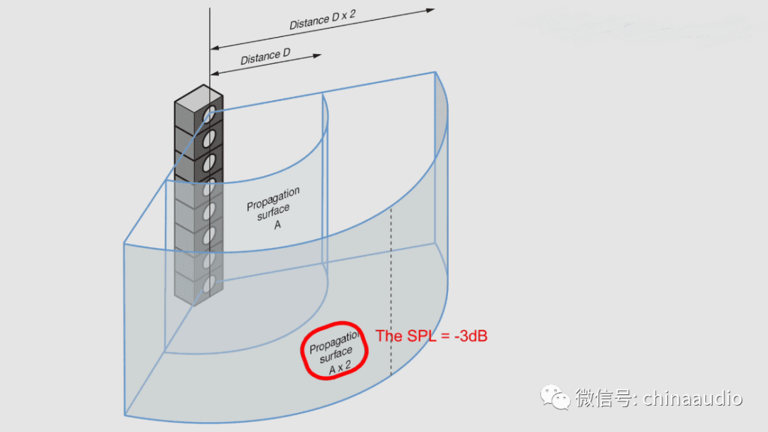点音源式的喇叭在扬声时,声音是以球型面积的方式在传导的,根据球型面积的公式来计算的话,距离每增加一倍,音量就会减少到剩四分之一(-6Db);线性音源是以圆柱体面积的方向传导,距离增加一倍时,音量只会减少一半(-3Db)。