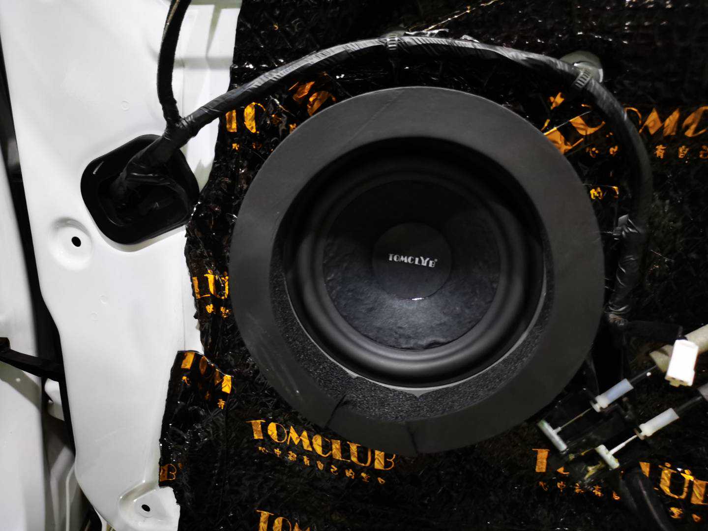首先使用TOMCLUB堂口隔音材料对汽车门板做隔音处理,让门板形成一个密封的箱体,可以让喇叭更好的发挥,又可以抑制钣金较薄所产生的共振与风噪等问题。