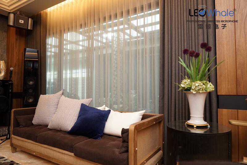 我看了看整体布置,很快就了解为何听起来温暖清晰,因为是内的三个沙发都是布质的,能吸收过量的高频。而地上铺了一大块厚地毯,也可以吸高频。左侧牆是用软皮绷的,也是软的,右侧牆则是窗帘,这些都可以吸收高频,所以听起来一点都不会吵,残响时间刚刚好。至于天花板,只是正常的天花板设计,不过那些曲线与高低层次也有让声波反射扩散的功用。再加上这个聆听空间是开放式的,声波不会在裡面「乱撞」,所以听起来好听。如果您府上有这麽大的空间,不妨也可以学著这样做。