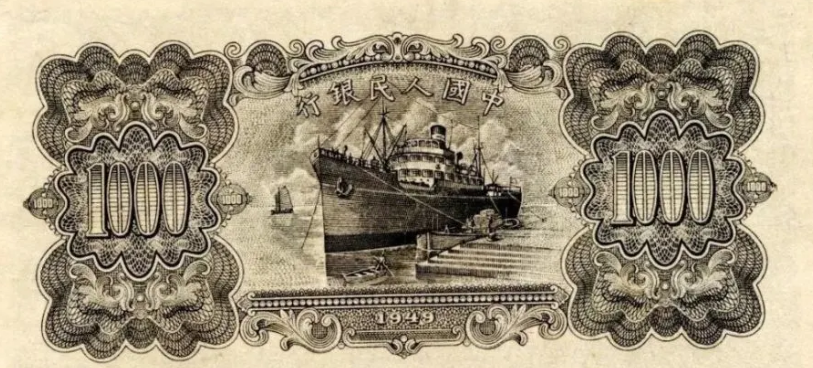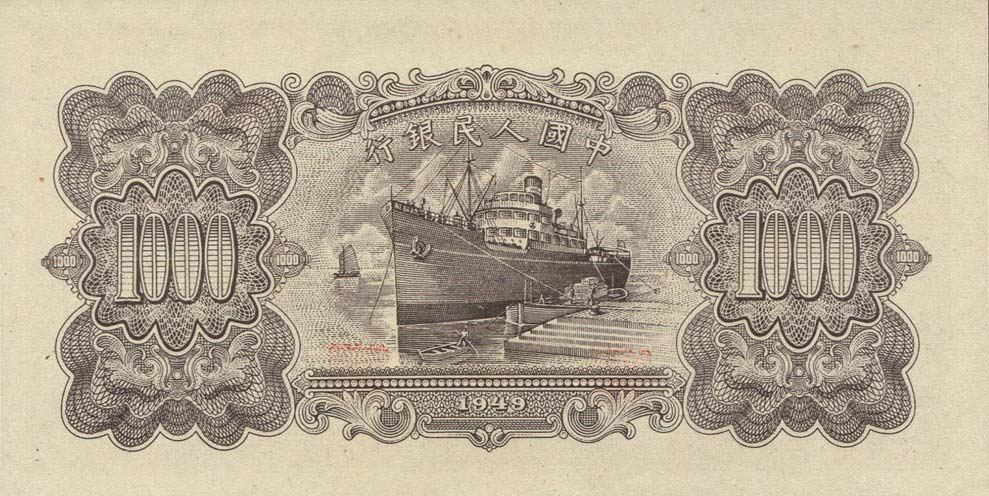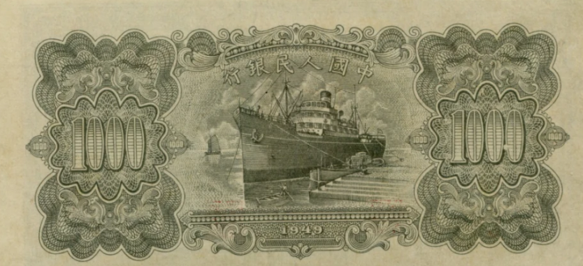 第一版人民币壹仟圆运煤与耕田背面
