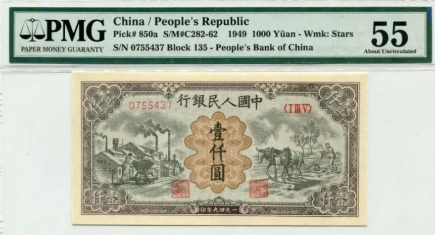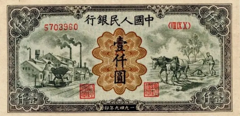 第一版人民币壹仟圆运煤与耕田正面
