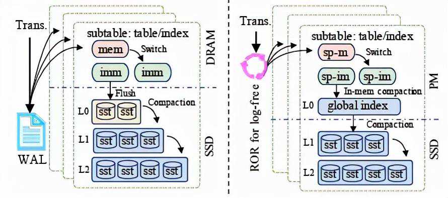 现有的基于LSM-tree架构的OLTP存储引擎的设计通常存在以下几个问题:(1)WAL位于写入关键路径中,尤其是为了满足事务的ACID属性,WAL通常以同步的方式写入到磁盘,因而拖慢写入的速度。此外,由于DRAM的易失性,设置过大的内存表虽然会提高系统的性能,但会导致WAL过大,影响系统的恢复时间。(2)level0数据块通常允许乱序,以加快内存中数据的刷盘速度。但乱序的数据块如果堆积过多,会严重影响读取性能,尤其是范围读取性能。直观上,可持久化字节寻址的PM可以用来实现持久化内存表,代替DRAM中的易失性内存表,从而减少维护WAL的开销。然而实际上,由于PM本身的特性,实现高效的持久化索引依然存在较大挑战,包括相应的PM内存管理。另外,当前PM硬件仅能保持8字节原子写入,导致为了实现原子写入语义,传统方法依然需要引入额外的日志(又称为PM内部日志)。