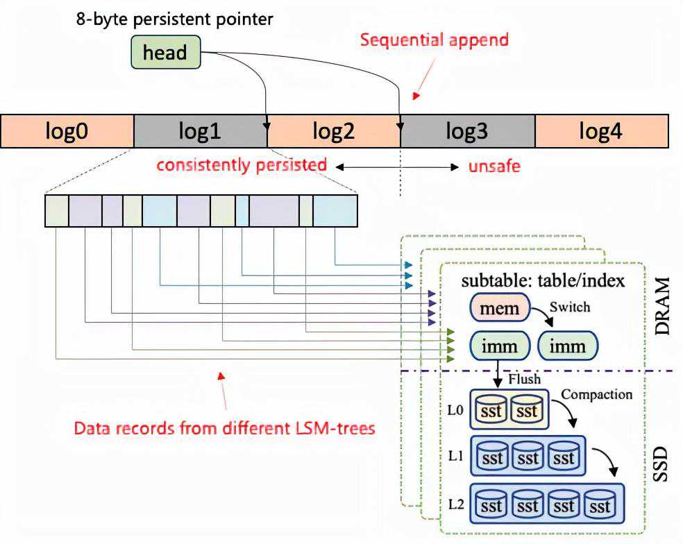 首先考虑数据生命周期的分离,一种较为直观的做法是针对每个LSM-tree实例设置单独的head指针,如图7所示,每个head负责指示其对应的内存空间的写入位置。不同的内存空间相互分离,具有独立的生命周期,其对应的LSM-tree中的memtable刷盘后可以立即回收而不需要等待其他LSM-tree实例。但该种做法存在一个明显的问题,单个事务可能会写入到多个LSM-tree,因此导致单次更新涉及到多个head的更新,进而硬件上无法保证写入的原子性。