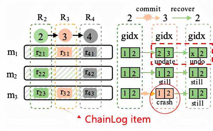 图9中的例子展示了该过程,其中ChainLog2(R2)已经被成功提交,R3等待被提交。但在R3提交的过程中系统发生异常掉电,导致R3中子项r31被成功提交,但r32未能成功提交。在系统恢复时,通过扫描所有LSM-tree实例中的最后一个ChainLog子项,可以获知当前最大的LSN为3。而r31已经成功提交,但其记录的子项数为2,但r32未能成功写入,因此其LSM-tree实例1的gidx会被回滚(通过简单快速的右移运算)。回滚后r31被丢弃,LSN回退到2,此时系统恢复到全局一致性状态。