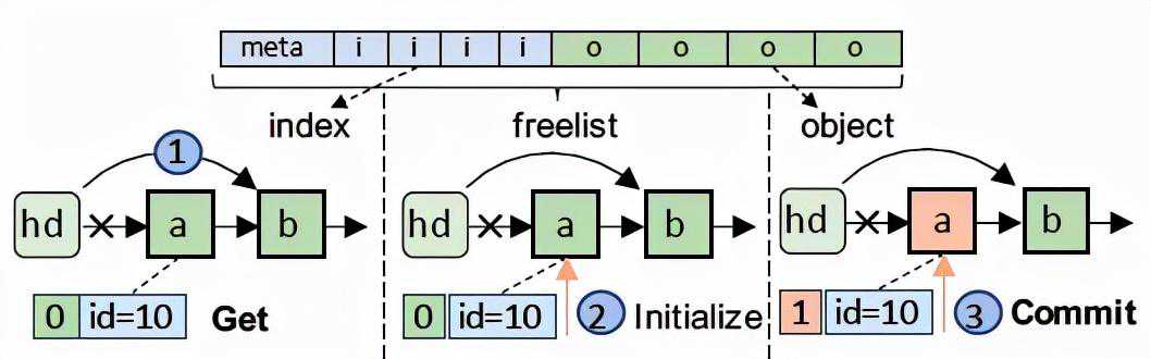 如图11所示,对于一个freelist,其在内存空间上是连续存储的,包括元数据区用于记录分配情况,通过索引区用于索引空闲的对象,以及对象区用于存储具体的对象。每个对象对应一个8字节的索引,每个索引的最高位用于标记该对象的持久化情况以确保原子化的对象分配与释放。Freelist提供四个接口用于完成一个对象的分配与释放:Get用于从freelist中获取一个对象,Commit用于通知Halloc该对象已完成初始化可以从freelist中移除,Check用于检测某个对象是否已被持久化避免故障重启时出现对象错误引用,Release用于释放一个对象。核心思想是通过在对象的索引设置持久化标志,已在重启时通过扫描识别出泄漏的对象。