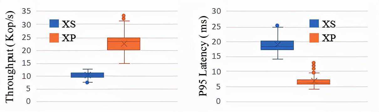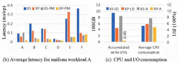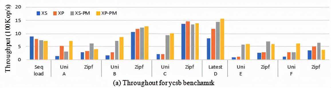 实验结果如图12所示,对于写密集型的负载A且随机请求下,XP/XP-PM的性能是XS/XS-PM的3.8以及2.3倍;在写密集型的负载F且随机请求下,XP/XP-PM的性能是XS/XS-PM的2.7以及2.2倍。且在图10中显示,XP的平均访问延迟要比XS低36%。在负载倾斜的情况下(Zipf=1),XP与XS性能表现接近,并且XP-PM表现要比XS-PM更低。这些结果表明,本文的方案对比基准系统在整体上性能表现更优异且产生更少的磁盘I/O。然而XP-PM的表现和XS-PM的表现差距不大,尤其是在负载倾斜下,XP-PM表现的不如基准系统XS-PM。但实际上该配置将数据全部放置于PM中,因为成本较为高昂,实际中不会采用。