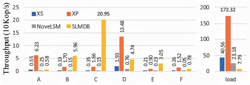 该实验首先采用YCSB标准的测试基准,共预先在数据库中加载80亿记录,平均分配到16的subtable,每个记录有8字节的key以及500字节的value,总共约500GB的数据量。实验中配置了4种配置:(1)基准系统且所有数据均放置到ESSD中(标记为XS),(2)改进的方案且配置使用200GB的PM空间由Halloc管理(标记为XP),(3)基准系统且将所有的数据放置在速度更快的PM中(标记为XS-PM),(4)改进的方案且将原先放置于ESSD中的数据放在PM中(标记为XP-PM)。配置(1)以及配置(2)是系统实际使用时的标准配置;而配置(3)以及配置(4)是主要用于评估移除ESSD后的系统性能表现。每个实验使用32个client线程,设置50GBrowcache以及50GB的blockcache,且运行30分钟以保证系统compaction得到及时的运行。