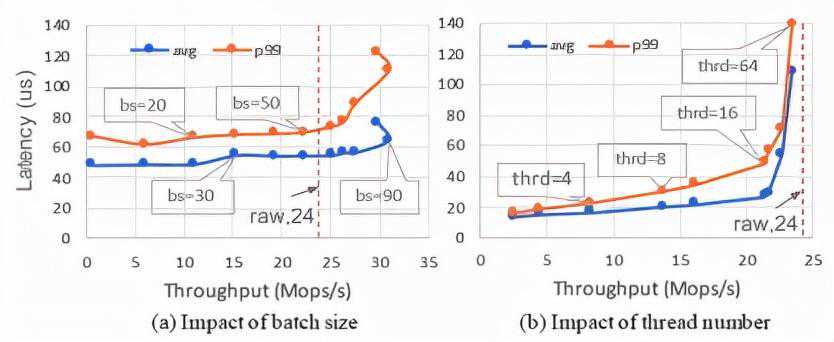 线程数的影响:实验中固定batchsize=50,调节线程数从1增加到64。图17(b)中的结果表明,在线程数从1增加到16时,其吞吐量呈线性增加。但当线程数大于16时,性能增长较为缓慢,比如线程数从16增加到64时,吞吐增加到1.1x,但P99延迟上升到2.9x。主要是因为较多的线程并发写入导致对PM硬件的访问竞争加大。实际中,选取合适的线程数以及batchsize需要根据具体的硬件设备以及工作负载。