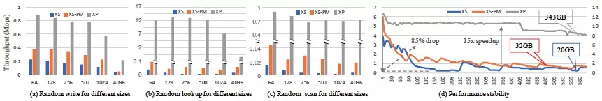 另一个实验使用32个client线程采用读写比为1:1的方式高压力写入数据,运行10分钟并观察系统性能随时间的变化。图18(d)并表明,XP相对于XS/XS-PM性能提升高达15x,并且性能表现更稳定。在实验中,XS以及XS-PM性能降低了85%,而XP仅降低35%。虽然XS-PM将数据放在速度更快的PM中(将PM用作普通磁盘),但其性能表现相对于XP仍具有较大差距,并且level0数据堆积依然会产生较大的影响。而XP采用全局有序的GI以及更高效的in-memorycompaction,大大降低level0的数据堆积的影响。
