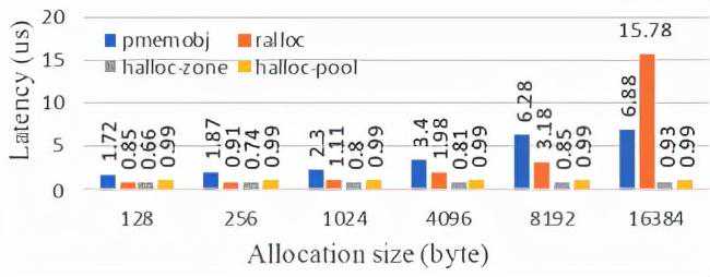 本实验通过对比Ralloc以及pmemobj以评估Halloc的持久化内存分配性能。Halloc将非持久化内存的管理托管到jemalloc中,因此其性能表现与同类方法相似。读者可以进一步参考文献[4]以了解更多将PM用作非持久化内存的分配器的性能表现。实验运行在单线程下,通过执行100万次内存分配计算单次分配的延迟,分配对象的大小从128字节到16KB。由于Halloc并非通用内存分配器,实验中通过从对象池中分配(Halloc-pool)以及通过grant(Halloc-zone)分别模拟通用内存分配的malloc操作。图19表明,Halloc-pool以及Halloc-zone在所有的测试中分配对象的延迟均小于1us,主要是因为Halloc对每次分配仅使用一个flush以及fence指令。但Halloc仅被设计用来支持基于LSM-tree的系统,通用性不如Ralloc以及pmemobj。