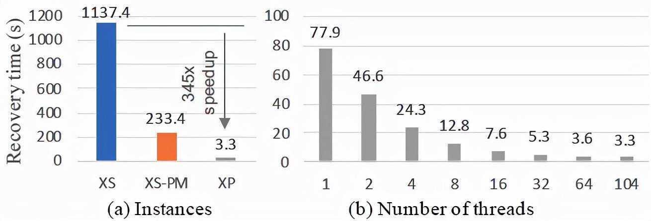 为了评估系统的恢复性能,实验中写入32GB的数据,其中key/value的大小分别为8字节/500字节,总计7000万个KV对。实验中GI采用非持久化索引,并保持数据全部落在GI。非持久化的GI使得系统重新启动时需要恢复GI中的所有索引,因而等价于需要恢复32GB的内存表。对于基线系统XS以及XS-PM(将WAL放置在PM中),系统关闭flush,因而保证至少32GB的有效WAL。由于XP可以并行的重建索引,实验中设置恢复线程的数量从1逐渐增加到104(所有的CPUcore)。图20表明,XP通过并行重建索引可以实现近秒级启动,然而XS以及XS-PM均需要耗费数分钟级的时间,其中一个比较重要的原因是基线系统仅支持单线程恢复。由于XP可以并行恢复,因此可以在系统启动时利用全部的CPU资源以加快启动速度。实际的应用场景中,内存表的大小通常远小于32GB,因此恢复时间可达秒级以下。极速的数据库可恢复性也许可以改变现有的通过主备等方式实现HA的方案,进而省略备用节点,具备降低一半的ECS实例潜能。