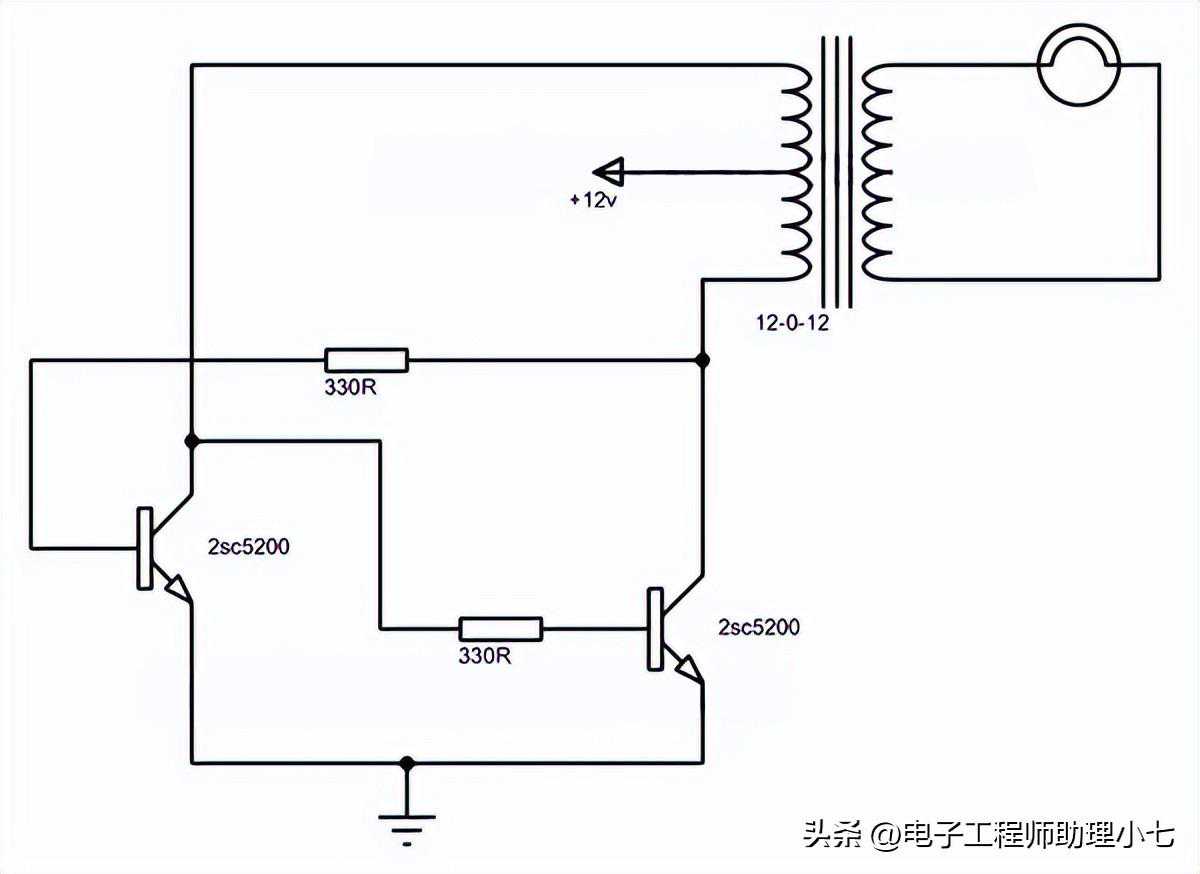 下图为采用2SC5200的微型逆变电路,该电路由2个2SC5200晶体管、1个升压变压器和一个电池组成。