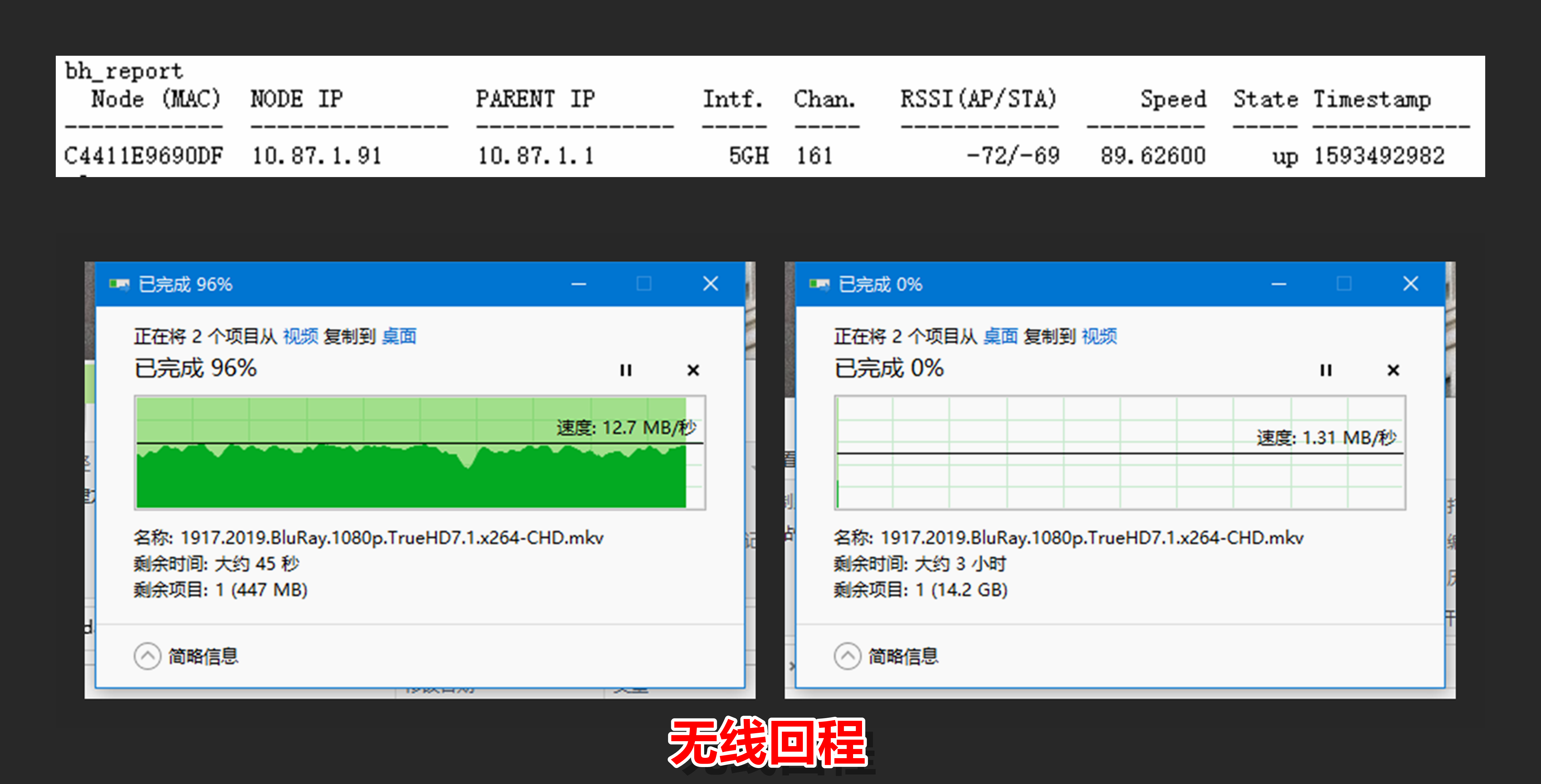 奈何我次卧要用有线网的设备太多,所以我选择了第二种思路:有线回程,我之前从客厅牵了一根10米的七类网线(万兆)就是为了给次卧预留升级。可以看到使用了有线回程之后,从【子节点】NAS→【主节点】笔记本的速率直接跑到113MB/s,从【主节点】笔记本→【子节点】NAS的速率提升到了60MB/s。所以我给大家的建议是装修早铺线,后面多省心,感觉以后我家装新房子都得七类线起步了,每个房间两个万兆网口。