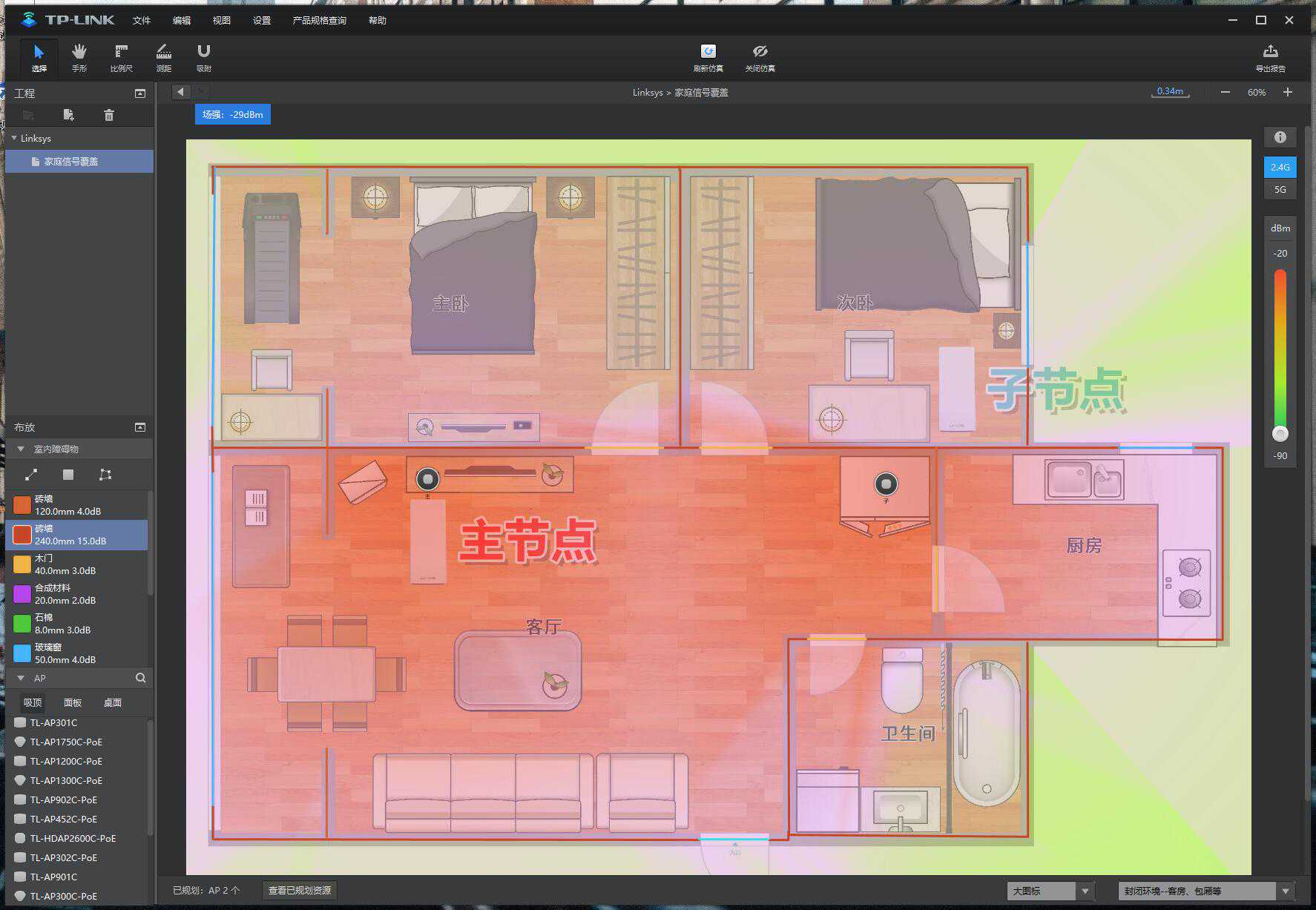 为了直观的给大家看看【信号漫游】的情况,借助Wi-Fi魔盒中的边走边测(安卓版本),上传提前画好的房屋平面图,选择了次卧、主卧、客厅、卫生间、厨房五个测试点进行了网络延时、漫游测试,测试手机为OPPOFindX2Pro。