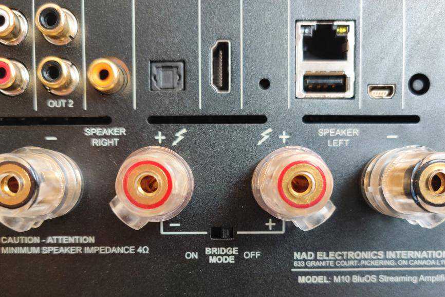 M10在机身背面除了兼容100-120V、200-240V、50/60Hz规格的三相电源接口,设置有较丰富的音频传输接口,除了搭配传统音源的2路RCA模拟输入、同轴和光纤数字输入外,HDMIARC接口可用于连接液晶电视,提升播放的娱乐影音内容音频质量,USB接口则可用于连接U盘、移动硬盘等存储设备,播放其中的高质量数字音频文件。M10的接线柱设有透明保护壳,保护壳在不影响直插接线的情况下,更方便卡孔接线的操作、增强连接处的防护性。此外,接线柱间还提供桥接桥接切换键,有需要条件的话,就可以将M10再连接后级,享受mono-mono方式推动带来的极致体验。