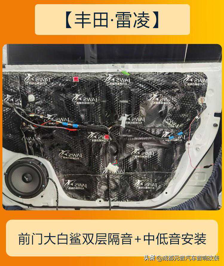 后台版跟车门做隔音,主要是防止中低频的共振,另外也能提升中低频的效果,同时能起到隔音密封的作用,中低音跟后台版的喇叭都是原装位置安装,由于原车没有高音位置为了获得更好的指向性所以直接安装在三角板上,更有指向性所以高音的效果也会更好,一套简单性价比高的音响效果到此就升级完成啦。
