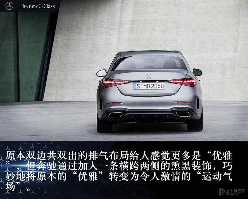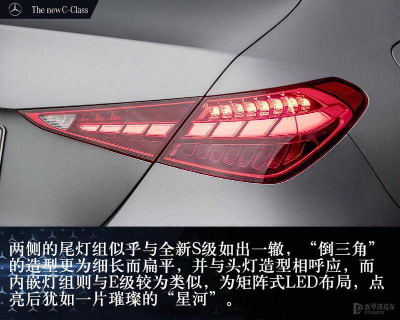 车身侧面,独特的双腰线的设计不仅凸显了层次感,也在一定程度上拉长了该车的视觉效果。尾部方面,新款奔驰C级尾灯的内部结构变得更加复杂精细,轮廓边缘以点亮时呈现“C”型的LED光带勾勒。