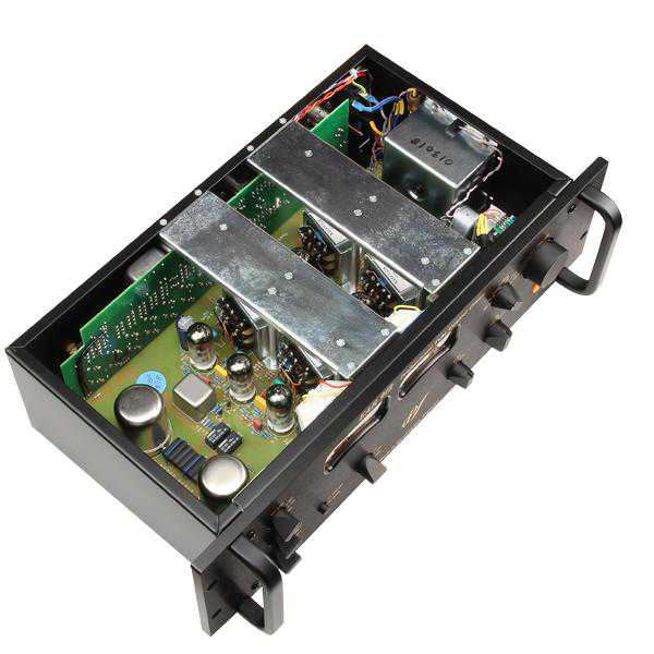 在机箱内部的最右边是电源变压器,以及电源供应线路。为了怕受到干扰,唱头放大线路安排在机箱最左边,二个MC唱头升压器安放在那里,旁边有一个密封金属盒,里面是以电感制成的RIAA等化线路,这也是少见的设计。此外还有二组分别标示3欧姆、6欧姆、12欧姆与40欧姆的继电器,作为MC唱头负载阻抗的切换。