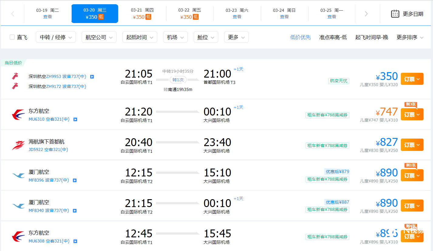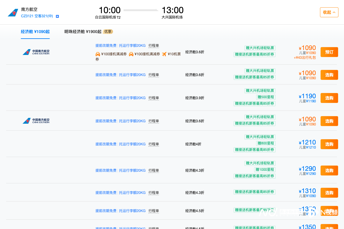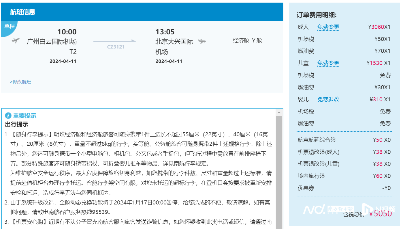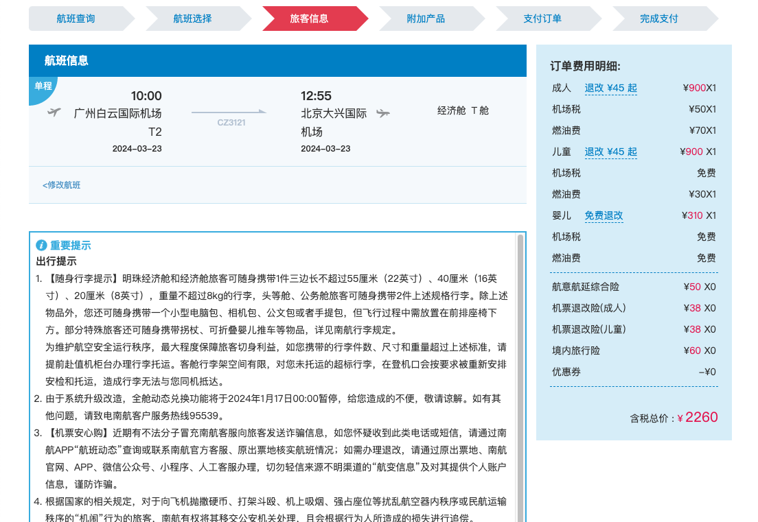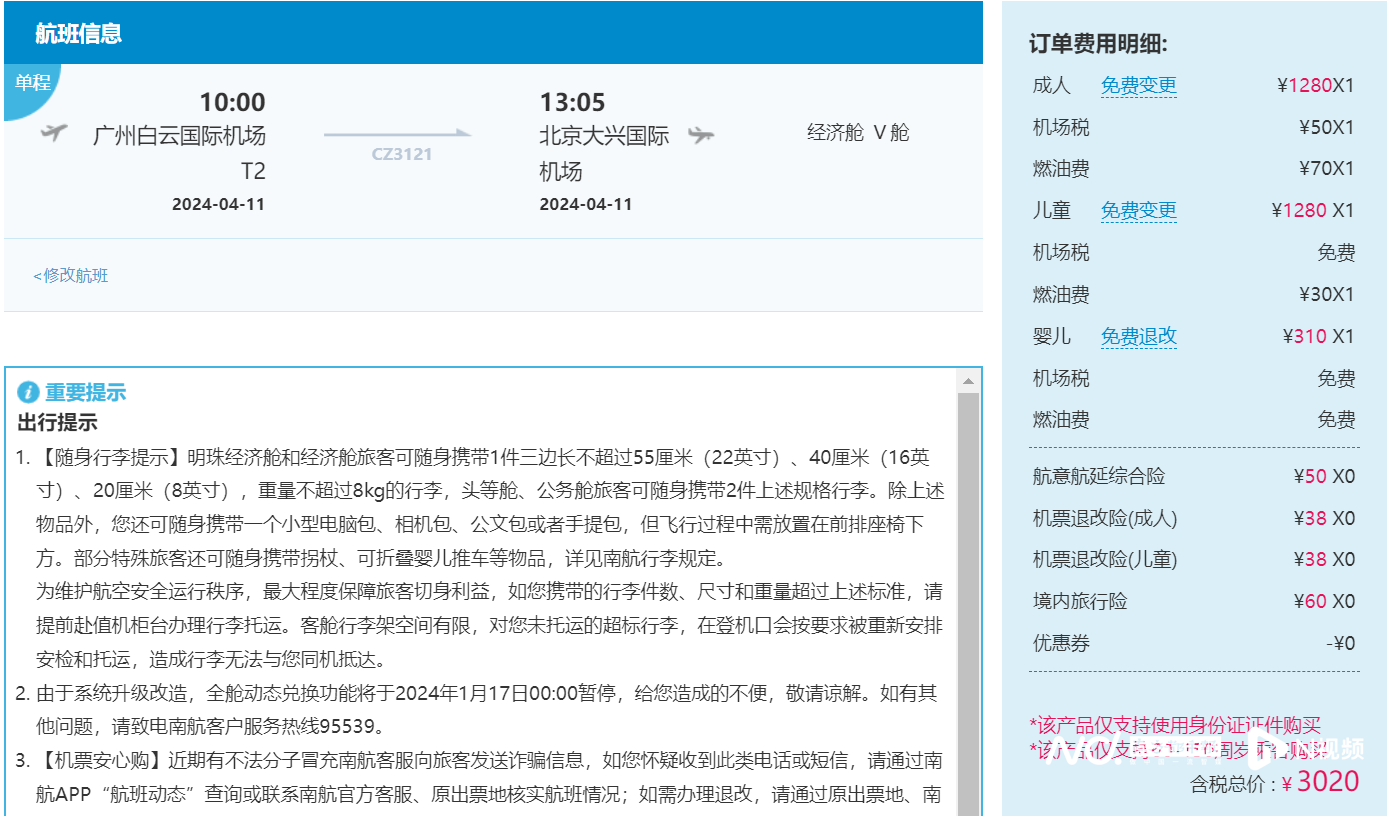 以南航为例,选择广州白云国际机场—北京大兴国际机场的CZ3121航班经济舱T舱,3月23日的成人、儿童票价为900元,婴儿票价为310元,4月11日的成人、儿童票价为1000元,婴儿票价为310元。